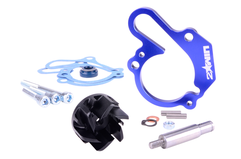 Pour répondre à ce besoin, 2WIN a développé ce kit de pompe à eau, qui augmente significativement le volume d'eau circulant dans le moteur et le radiateur. La turbine incluse dans le kit dispose de surfaces de volute quasiment doublées, et la cale usinée en CNC permet de décaler le couvercle de la pompe à eau pour accueillir cette turbine de plus grande taille.