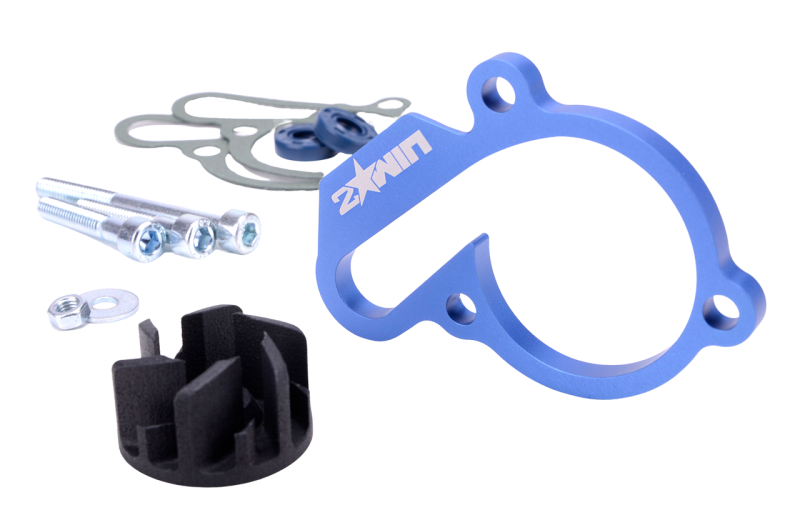 Pour répondre à ce besoin, 2WIN a développé ce kit de pompe à eau, qui augmente significativement le volume d'eau circulant dans le moteur et le radiateur. La turbine incluse dans le kit dispose de surfaces de volute quasiment doublées, et la cale usinée en CNC permet de décaler le couvercle de la pompe à eau pour accueillir cette turbine de plus grande taille.