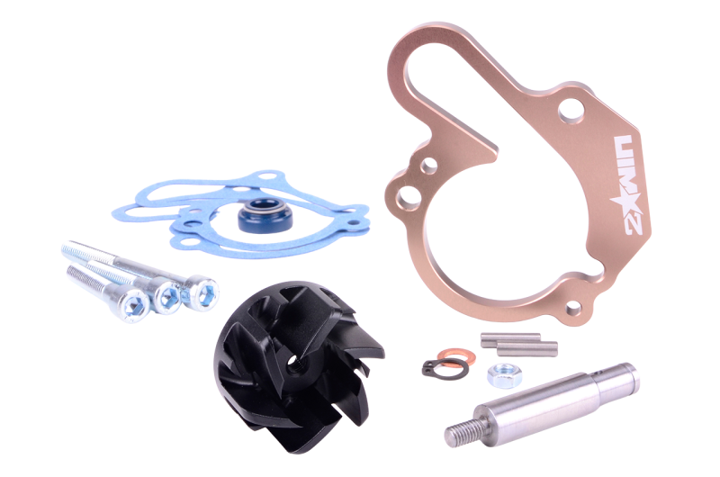 Pour répondre à ce besoin, 2WIN a développé ce kit de pompe à eau, qui augmente significativement le volume d'eau circulant dans le moteur et le radiateur. La turbine incluse dans le kit dispose de surfaces de volute quasiment doublées, et la cale usinée en CNC permet de décaler le couvercle de la pompe à eau pour accueillir cette turbine de plus grande taille.