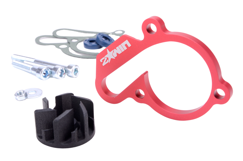 Pour répondre à ce besoin, 2WIN a développé ce kit de pompe à eau, qui augmente significativement le volume d'eau circulant dans le moteur et le radiateur. La turbine incluse dans le kit dispose de surfaces de volute quasiment doublées, et la cale usinée en CNC permet de décaler le couvercle de la pompe à eau pour accueillir cette turbine de plus grande taille.