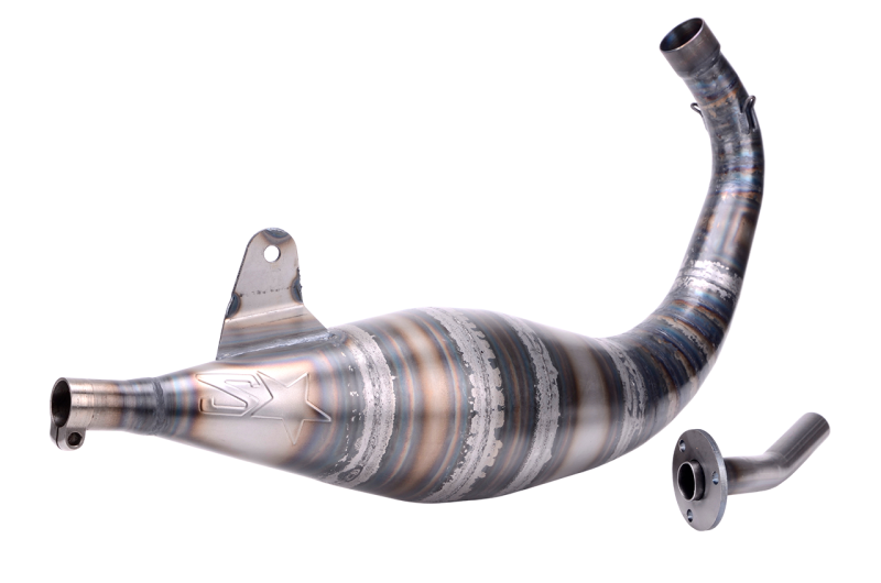 Ce pot est entièrement fabriqué à la main avec la technique du roulé-soudé, en tôle fine de 8/10 mm d'épaisseur. Les soudures sont réalisées bord à bord sans métal d'apport, garantissant ainsi la meilleure qualité possible pour un échappement de compétition. La sortie du tube de fuite est démontable et réglable, permettant un ajustement précis de sa position.Cette caractéristique offre aux préparateurs expérimentés la possibilité de tester différents types de stinger.